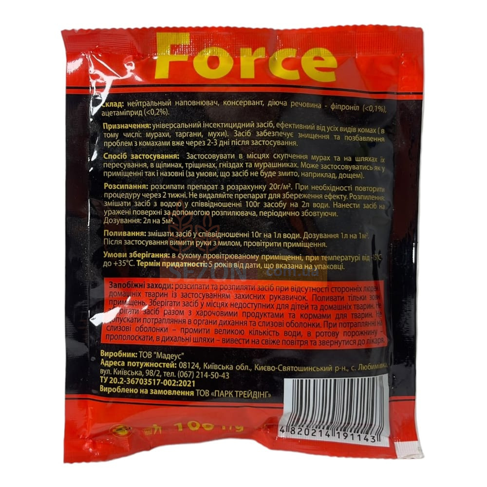 Инсектицидный порошок "Force" — это эффективное средство для борьбы с различными видами муравьев, такими как садовые, рыжие, фараоновы и муравьи-древоточцы. Препарат идеально подходит для обработки жилых и нежилых помещений, общественных столовых, складов, подвалов и садовых участков. Действие препарата основано на двух активных компонентах — фипронил и ацетамиприд, которые поражают нервную систему насекомых, вызывая паралич и гибель уже в течение нескольких часов. Средство начинает действовать в течение 2-3 дней, уничтожая значительное количество насекомых. Порошок "Force" также эффективно борется с другими бытовыми вредителями, такими как тараканы, мухи и мошки.