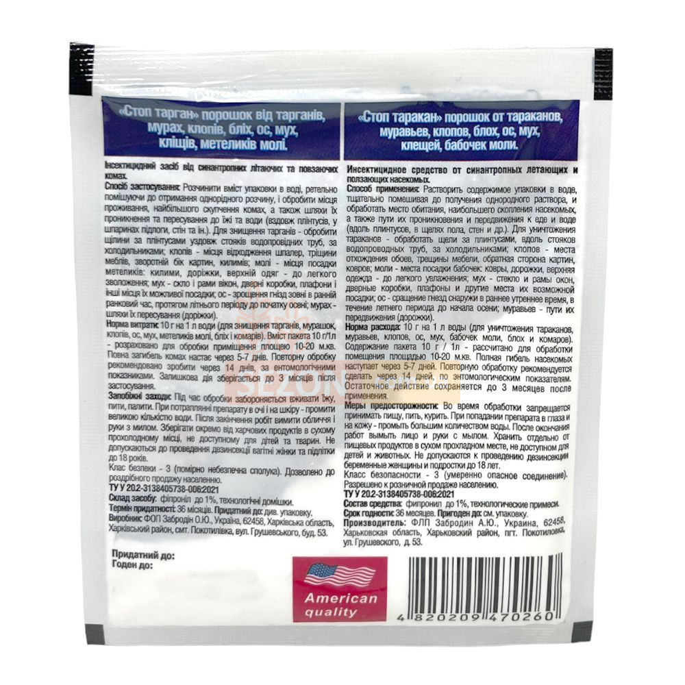 Инсектицид в форме порошка "Стоп Таракан", созданный по методике Корнельского университета в США, служит для эффективной борьбы со множеством летающих и ползающих синантропных насекомых, в числе которых все разновидности тараканов и муравьев. В его состав входит активное вещество - фипронил, контактно-кишечный инсектицид с умеренными системными эффектами. При проникновении в тело насекомого фипронил нарушает работу нервной системы, что ведет к его гибели от паралича в течение нескольких часов после попадания инсектицида в организм. Инсектицид умирает не моментально, что позволяет ему заразить других членов колонии, распространяя яд по всему населению. За 5-7 дней происходит полное устранение колонии насекомых. "Стоп Таракан" в форме порошка активно используется для дезинфекции жилых, производственных и профилактических помещений, складов, амбаров, подвалов, погребов и хранилищ от рыжих, черных и других видов тараканов, садовых, рыжих, фараоновых муравьев, древоточцев-муравьев, а также мух, клопов, моли, блох, ос, мух, бабочек, клещей.