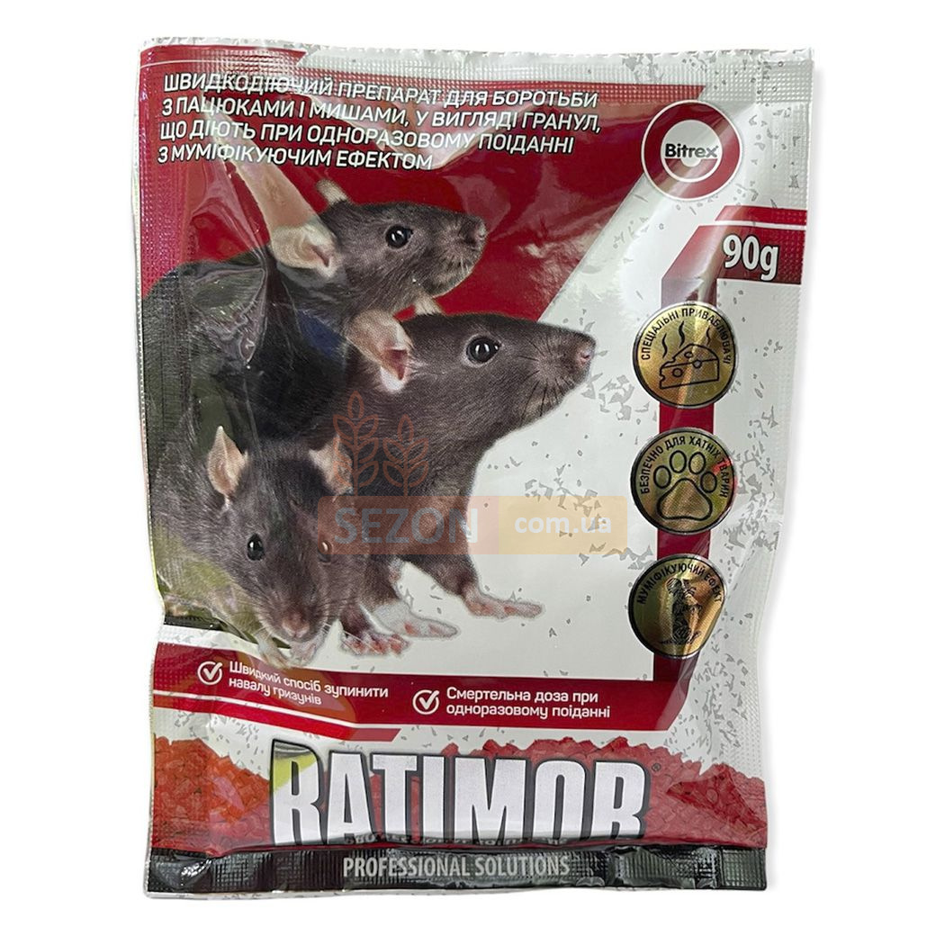 Ратимор( Ratimor) от крыс и мышей 90 гр – гранулированная приманка готова к применению, предназначенная для уничтожения мышей и крыс в жилых помещениях, складах, подвалах, а также на приусадебных участках. Содержит действующее вещество бромодиолон одноразового потребления в концентрации 0,005, а также пищевые составляющие, привлекающие вещества и мумификатори, что тормозят разложение мертвых грызунов. Крысы и мыши начинают погибать за 4-5 дней, мумифицируются не испуская неприятного запаха продуктов разложения.