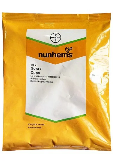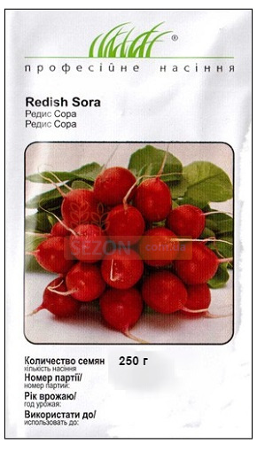 Сора - скороспелый сорт редиса, обладает крупными плодами и при этом не образует внутренних пустот. Плод формируется на 20 день после всхода. Плоды круглые, хрустящие, с приятным вкусом и долго сохраняют свой товарный вид.