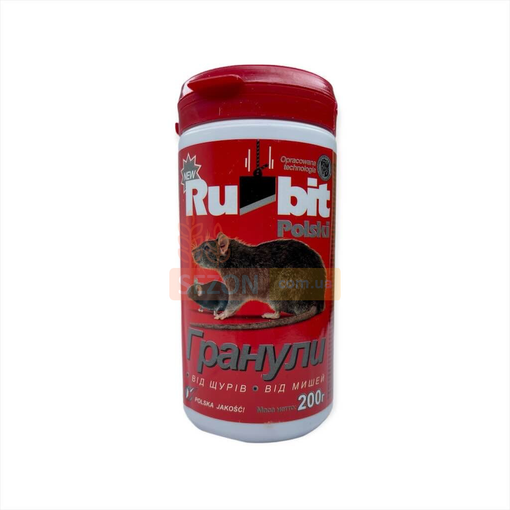 Средство для борьбы с грызунами Rubit Polski в форме гранул, произведённое в Украине по польским стандартамRubit Polski - это розовые или красные гранулы, изготовленные по польскому рецепту, служащие защитой жилых, производственных, вспомогательных и складских помещений, дачных и садовых участков, амбаров, погребов, подвалов, запасов урожая в хранилищах от крыс, мышей, полевок и других грызунов. В активных компонентах данного препарата содержится бродифакум, родентицид кишечного действия и синтетический антикоагулянт, нарушающий образование белков протромбинового комплекса. После приёма смертельной дозы этого препарата в течение суток у грызунов наступает резкое снижение свёртываемости крови, что вызывает внутренние кровотечения и смерть. Грызуны обычно погибают на 3-5 день после поедания приманки, в основном на открытом воздухе. Добавки к родентициду Rubit, обладающие ароматом, активно привлекают грызунов и стимулируют их к поеданию приманки. В состав этого препарата включен также компонент Битрекс с горьким вкусом, чтобы предотвратить случайное употребление родентицида домашними животными.