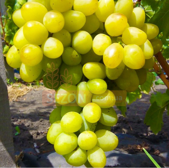 Ягоды белого цвета, на солнце приобретают красивый жёлтый оттенок. Форма овальная или конусная. Мякоть мясисто-сочная, кожица съедаемая. Вкус гармоничный, с приятным мускатным оттенком. Грозди большие, умеренно рыхлые, без горошения.