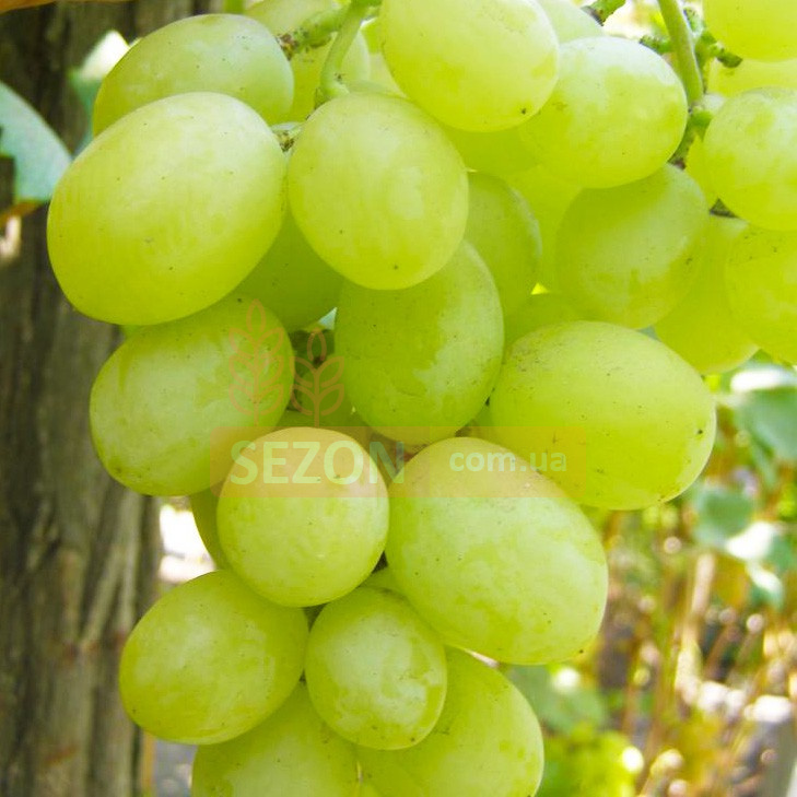 Грозди цилиндроконические, средней плотности или рыхлые, массой 600–800 г, отдельные — ещё крупнее. Ягоды овальные, молочно-белые, на солнечной стороне с лёгким загаром, массой 7–9 г. Вкус гармоничный, с тонким мускатным оттенком. Мякоть мясистая, кожура плотная, но легко съедаемая.