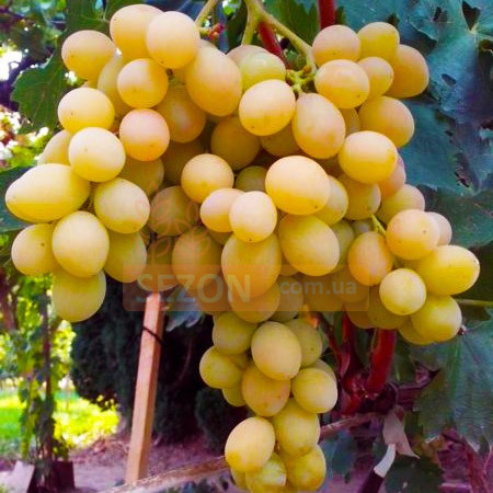 Грозди крупные, в среднем по 600 г, удлинённой формы, умеренно рыхлые, часто с характерным крылом. Ягоды крупные — до 6 г, овальные с лёгким заострением на конце. Окраска — жёлто-зелёная, кожура тонкая, но прочная. Мякоть плотная, сочная, с гармоничным вкусом и лёгким мускатным оттенком. Сорт не содержит семян, что делает его особенно удобным в употреблении.