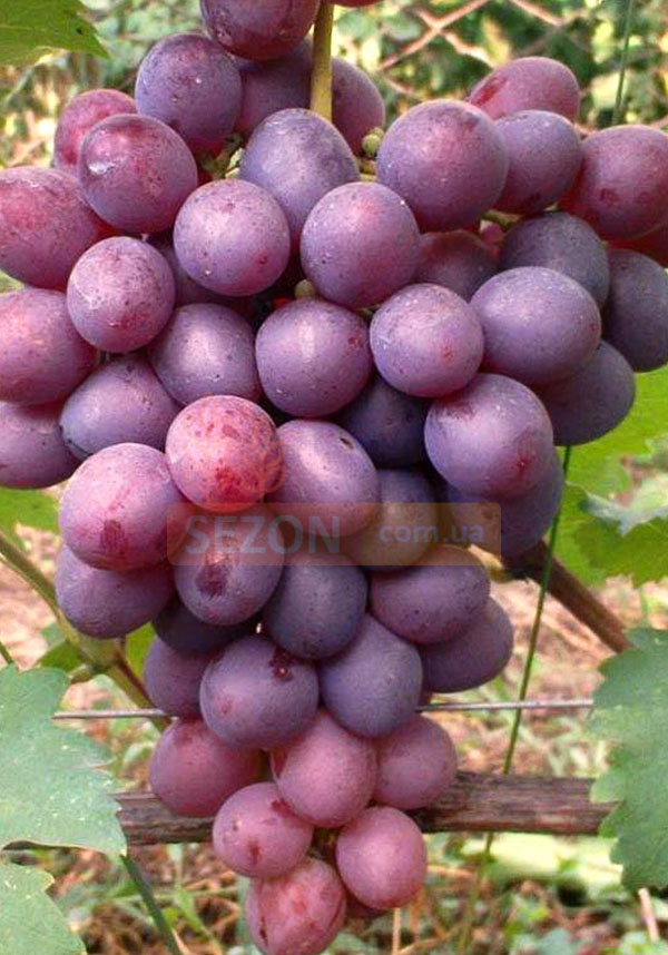 Саженцы этого винограда среднерослые. Побеги вызревают хорошо. Количество плодоносных побегов — 60-80%. Отдельные грозди могут при правильной агротехнике достигать и 2 кг, но в основном их вес составляет 600-700 г. Ягоды винограда достаточно крупные, размером 30 на 22 мм, весом в 10-12 г, овальной формы, окраска их красивая, красно-фиолетовая.