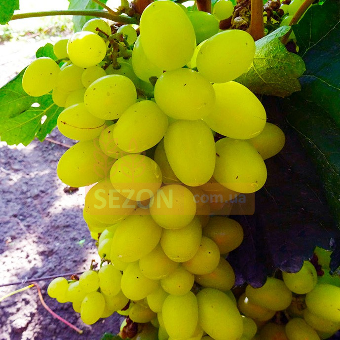 Грозди плотные, крупные, привлекательные внешне. Ягоды одинаковые по размеру, белые, массой 8–10 г. Благодаря плотной консистенции мякоти виноград хорошо хранится и подходит для транспортировки. Вкус сладкий и гармоничный, без выраженного аромата, приятный даже в свежем виде.