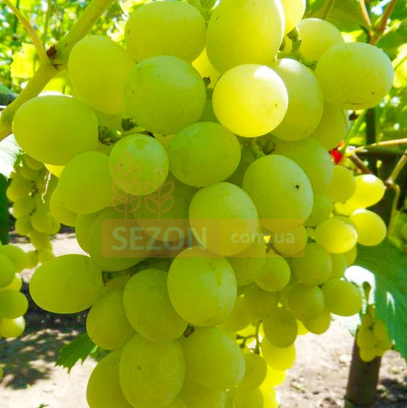 Грозди очень крупные, цилиндроконические, слегка рыхлые, массой 800–1500 г. Ягоды крупные, круглые или овальные, массой 15–20 г, зелёно-жёлтые, при полном созревании становятся янтарными, иногда с розовым оттенком. Мякоть средней плотности, вкус гармоничный, сортовой, с лёгким мускатным ароматом.
