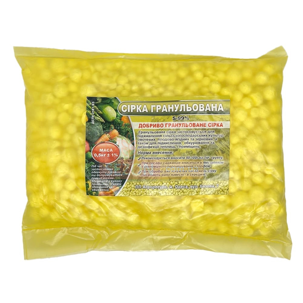 Сера гранулированная — это минеральное удобрение в форме гранул, которое применяется для сельскохозяйственных культур, подкисления почвы и защиты растений. Средство используется для овощных, плодово-ягодных и зерновых культур, а также подходит для обработки теплиц и помещений.