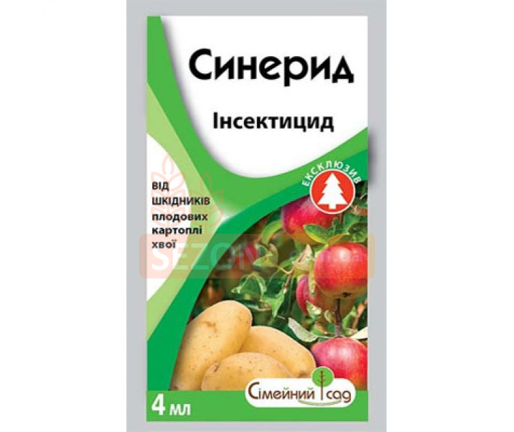 "Синерид" эффективно используется для обработки яблонь, слив, груш, персиков, вишен, черешни, рапса, картофеля, а также хвойных культур, таких как самшит, кипарисовик, тис, туя, ель, сосна и другие декоративные культуры. Этот инсектицид надежно защищает от садовых долгоносиков (почкоеда, яблоневого цветоеда), яблоневой плодожорки, аленки мохнатой, яблоневого пилильщика, листоверток, минирующих молей, колорадского жука, тли, трипсов, рапсового цветоеда, рапсового пилильщика, совок, скрытнохоботников, хвоегрызущих, листогрызущих и сосущих насекомых, соснового подкорового клопа, короеда и многих других вредителей.