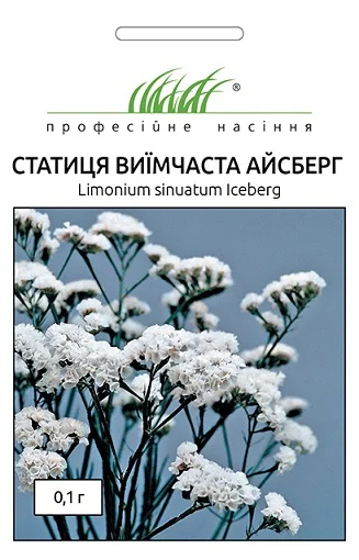Статица выемчатая Айсберг - однолетнее растение с прямостоячими стеблями, разветвленными в верхней части, высотой 60-70 см. Растение обильно цветет с июля. Цветы небольшого размера (до 1 см в диаметре), белого цвета. Статицу можно выращивать и через рассаду, и прямым посевом в открытый грунт в мае. Прекрасно смотрится на клумбах. Чаще всего используется для зимних цветочных композиций.