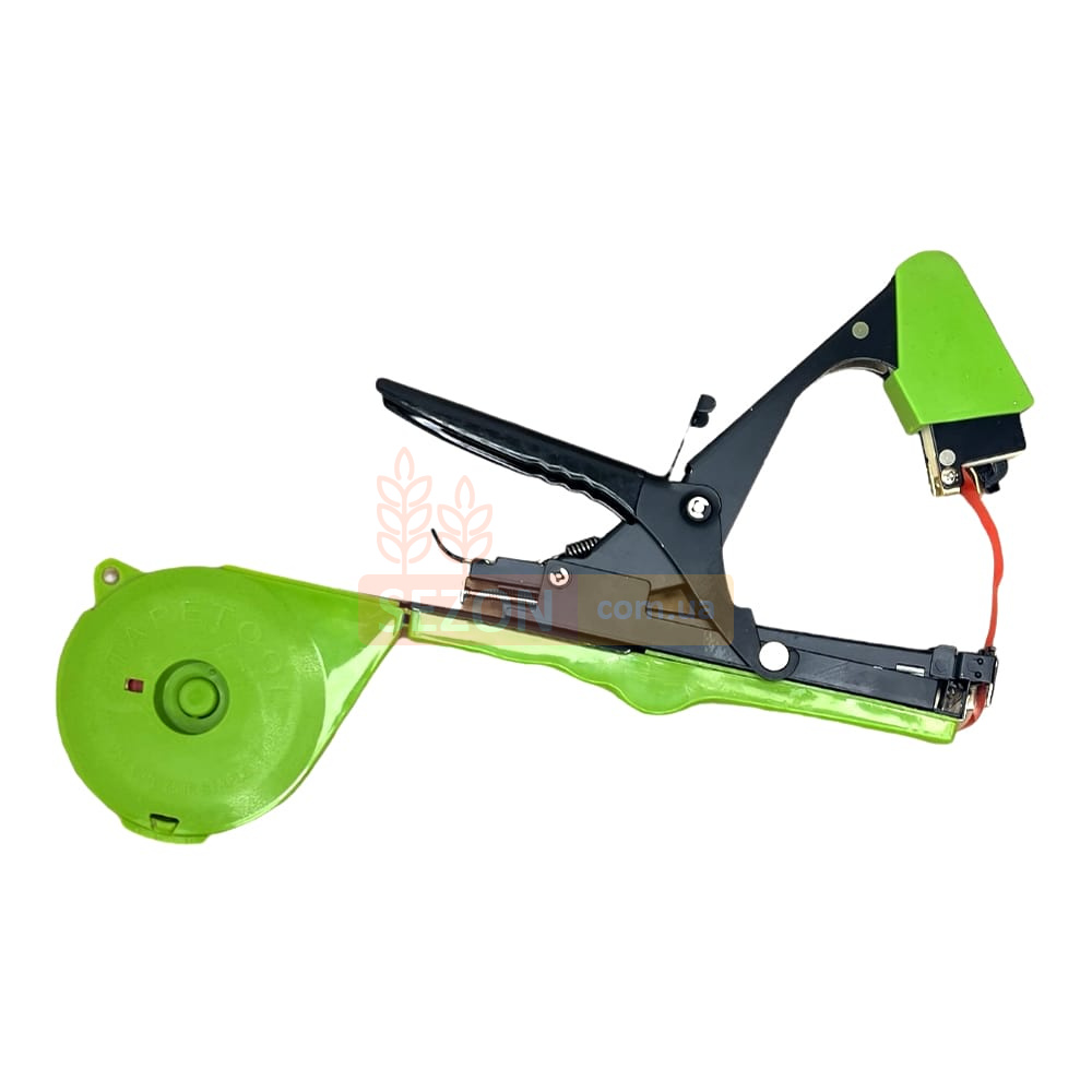 Степлер оснащён специальной лентой и скобами. Работа с устройством проста: при нажатии на рычаг вытягивается лента, которой обхватывают стебель растения и опору. При втором нажатии рычага скоба надёжно соединяет концы ленты и одновременно обрезает их, обеспечивая прочную и аккуратную фиксацию растения.