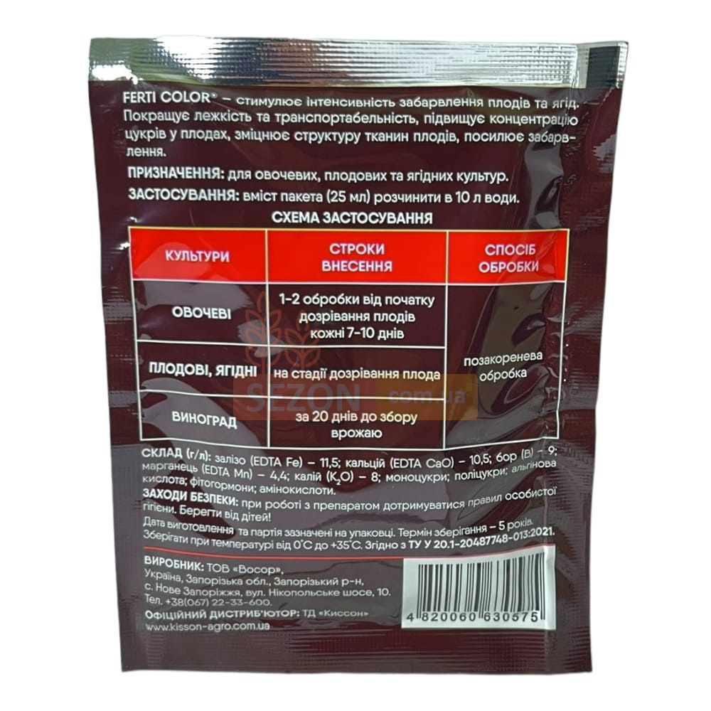 ПРИМЕНЕНИЕ: FERTI COLOR® предназначен для обработки овощных, плодовых и ягодных культур. Разведите содержимое пакета (25 мл) в 10 литрах воды для получения рабочего раствора.
