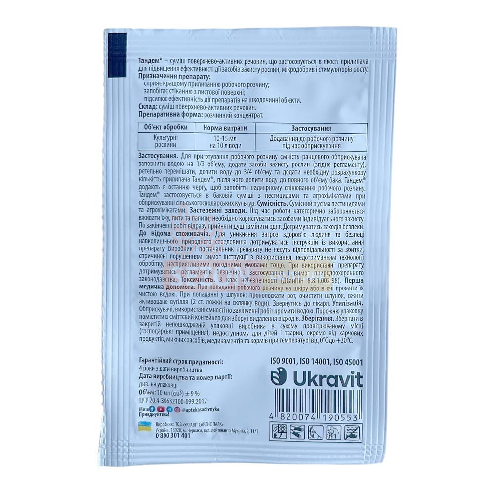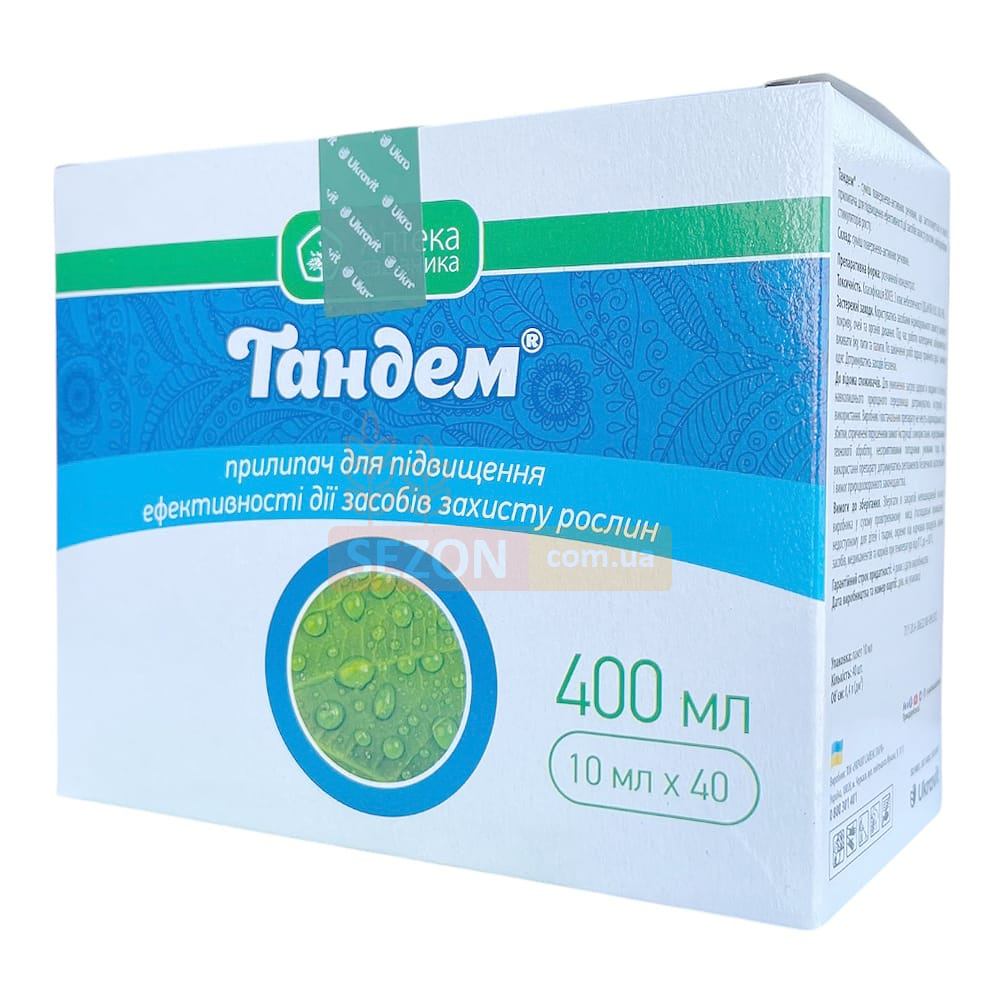 Тандем — это современный прилипатель (адъювант), предназначенный для повышения эффективности применения средств защиты растений, стимуляторов роста и микроудобрений. Благодаря содержанию поверхностно-активных веществ, препарат способствует лучшему распределению и удержанию рабочего раствора на растительной поверхности, снижая потери препарата и увеличивая площадь покрытия.