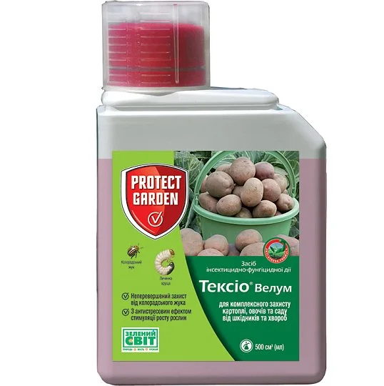 Инсекто-фунгицидный обработчик Тексио Велум Protect gardenКачественный продукт, созданный фирмой "Bayer", применяется для трактовки сеянцев, включая: картофель, помидоры, яблоко, виноград, клубника, крыжовник, персик, вишня, черешня, лук, чеснок, капуста, огурцы, перец, арбуз, дыня, роза, рапс, горох, редька, сельдерей, баклажан, свекла, ячмень, слива, груша, с целью оберегания от насекомых и болезней во время начального роста растений. Средство эффективно борется с вредителями, такими как колорадский жук, тля, трипс, совка, цветоед, долгоносик, плодожорка, пипильщик, моль, листовертка, муха, блошка, белокрылка, клещ, клоп, щитовка, цикадка, стеклянница, мертвоед, червец, мотылёк, а также с заболеваниями, такими как ридоктониоз, фитофтороз, септориоз, оидиум, милдью, альтернариоз, пятнистости, антракноз, ржавчина, хлороз, мучнистая роса, бактериоз, монилиоз, фомоз, альтернариоз, переноспороз, парша. Средство проникает в растение, защищает надземную часть и корневую систему, обладает стимулирующими свойствами роста, что обеспечивает увеличение урожая и увеличивает устойчивость растений к неблагоприятным условиям окружающей среды.
