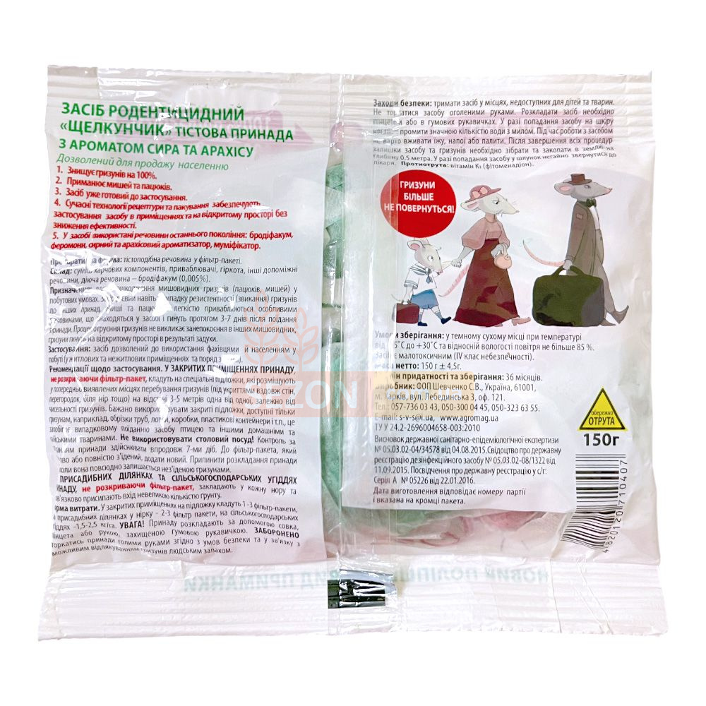 Приманка для крыс и мышей Щелкунчик, произведенная компанией AgroProtection Украина, представляет собой продукт, готовый к немедленному использованию. Она создана в форме тестовой субстанции и служит для обеспечения безопасности жилых, промышленных, вспомогательных и складских помещений, хранилищ, дач, приусадебных зон, погребов и подвалов от крыс, мышей, полевок и других грызунов. Эта приманка включает бродифакум и сырный и арахисовый привлекатель, который сильно привлекает грызунов и делает ее аппетитной для них. Спустя сутки после приема смертельной дозы, уровень свертываемости крови у грызунов резко снижается, что в конечном итоге приводит к внутреннему кровотечению и смерти вредителя. Данный препарат быстро и надолго избавит вас от всей популяции грызунов, так как они умирают в течение 3-7 дней после употребления смеси. Избегайте контакта с приманкой непосредственно руками, чтобы не отпугивать грызунов человеческим запахом. Родентицидное тесто содержит мумификатор, который предотвращает разложение мертвых грызунов и появление неприятного запаха.