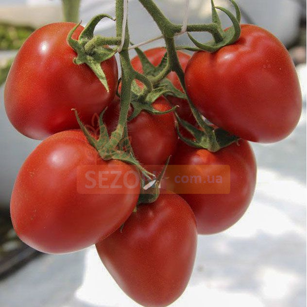 Куст индетерминантный, сильнооблиственный, с большой энергией роста. Формировка в 2 стебля значительно увеличит урожайность. Возле плодоножки образовывается колено, что облегчает уборку урожая. Каждая кисть формирует 8-10 томатов сливовидного типа, весом в 160-170 г. Кончик иногда бывает заостренный. Цвет очень сочный, интенсивно-красный. Зеленого стержня внутри нет. Мякоть плотная, мясистая. Вкус кисло-сладкий. Спектр использования широкий. Транспортируются отлично.