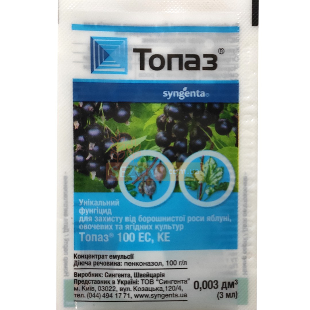 Интернет-магазин Sezon предлагает купить оптом или в розницу крупным растениеводческим фирмам, дачникам, садоводам-любителям оригинальный фунгицид системного действия Топаз 3 мл (Syngenta) для обработки винограда, смородины, огурцов, томатов с доставкой в любой населённый пункт Украины; инструкция к применению прилагается.