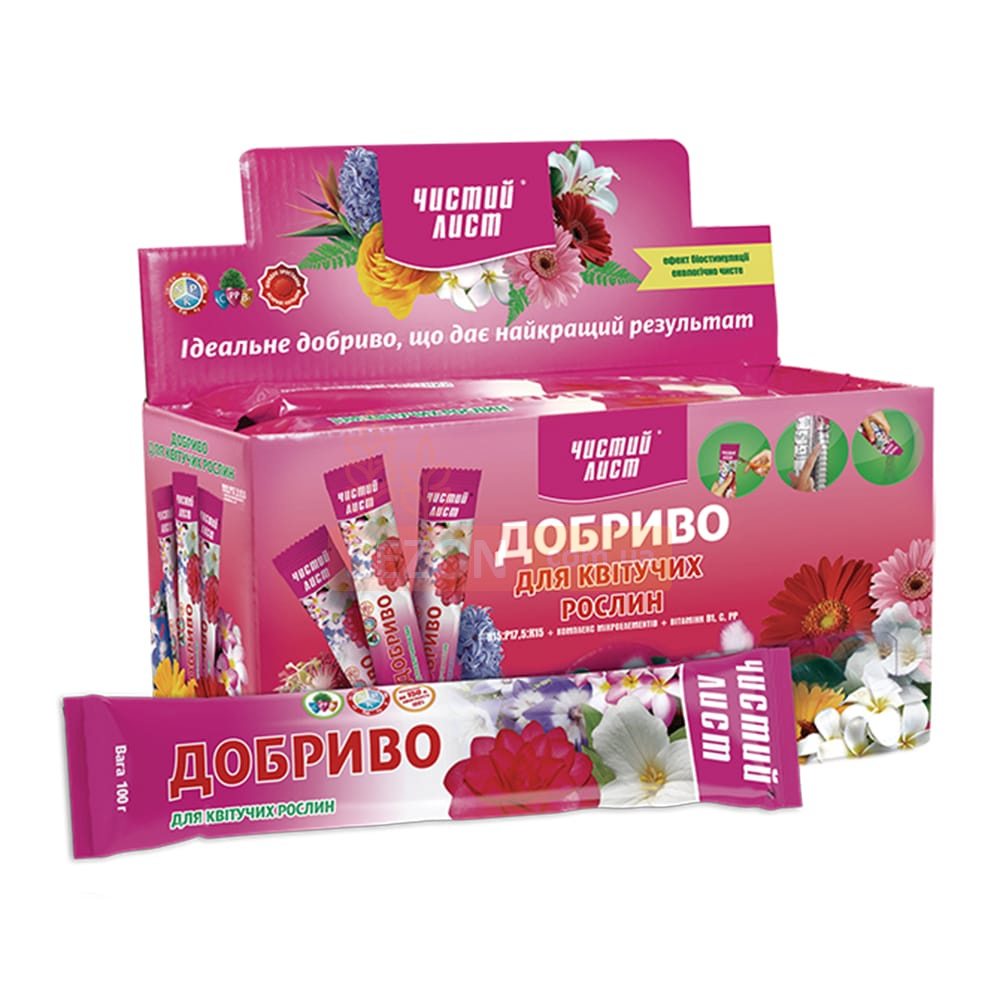 «ЧИСТЫЙ ЛИСТ» — минеральное удобрение, разработанное для всех видов цветущих культур, выращиваемых в открытом и закрытом грунте. Оно содержит комплекс макро-, мезо- и микроэлементов, а также витамины, поддерживающие растения в период роста и цветения.