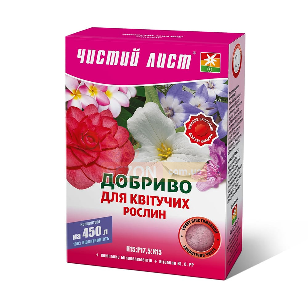 «ЧИСТЫЙ ЛИСТ» — минеральное удобрение, разработанное для всех видов цветущих культур, выращиваемых в открытом и закрытом грунте. Оно содержит комплекс макро-, мезо- и микроэлементов, а также витамины, поддерживающие растения в период роста и цветения.