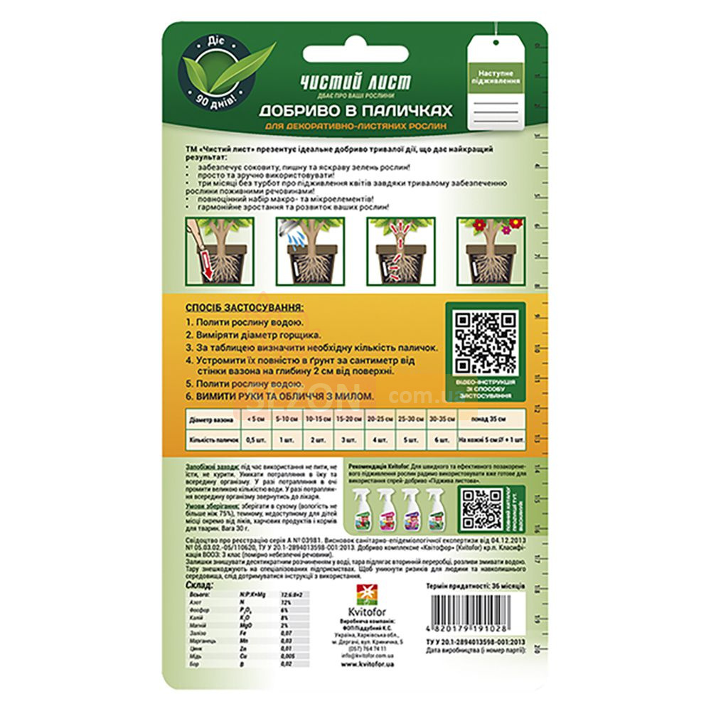 Удобрение «Чистый лист» в форме палочек — это удобный способ обеспечить декоративные и комнатные растения всеми необходимыми элементами питания на протяжении длительного времени. Палочки обеспечивают плавное и сбалансированное поступление питательных веществ, что позволяет избежать перекорма и поддерживать здоровый вид зелёной массы.