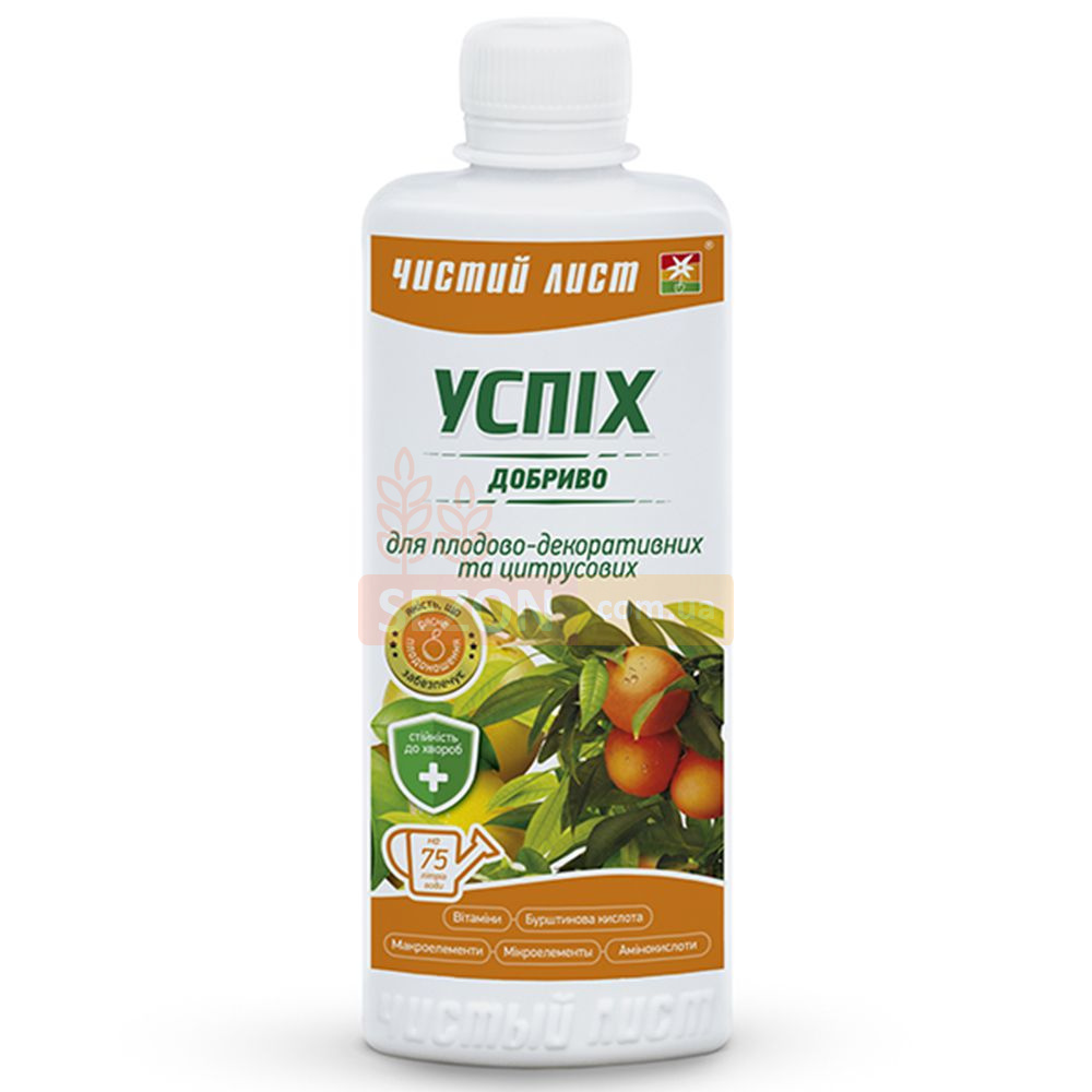 Минеральное удобрение «Успех» предназначено для полноценного питания плодово-декоративных и цитрусовых растений. Содержит макро- и микроэлементы в легкоусвояемой форме, а также комплекс витаминов, аминокислот и янтарной кислоты. Регулярное применение способствует формированию здоровых плодов, усиленному цветению и развитию сильной корневой системы. Средство эффективно предотвращает хлороз и повышает устойчивость растений к болезням и стрессовым факторам.
