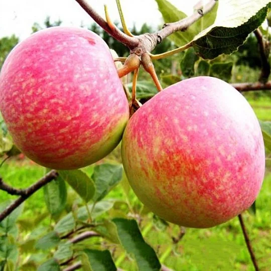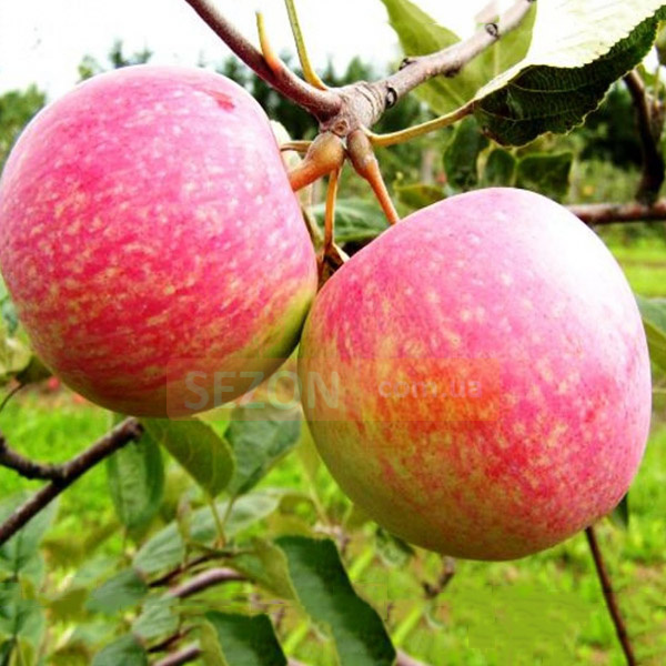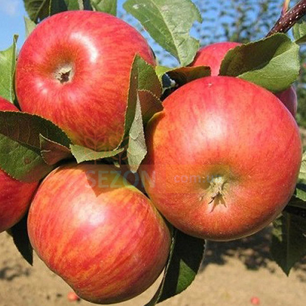 Дозревание плодов происходит неравномерно. Яблоки средних размеров, от 80 до 120 г, округлые и ровные. Окрас – ярко-желтый с полосатым красным румянцем. Мякоть очень нежная и сладкая, в стадии полной зрелости – наливные. Сорт высокоурожайный, плоды хорошо хранятся в холодильнике до трех недель.