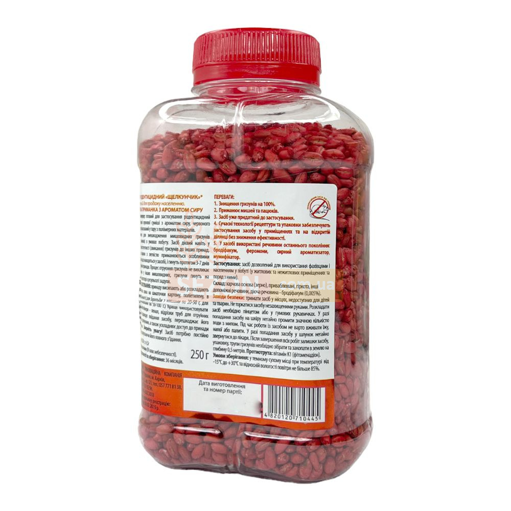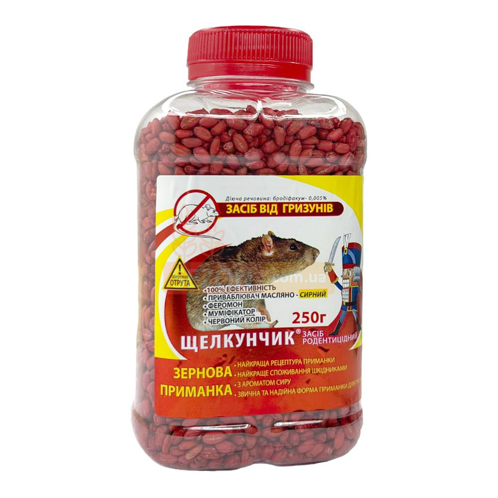 Приманка под названием Щелкунчик, представляющая собой зерновую композицию с ароматом, используется для ликвидации и предотвращения появления крыс и мышей в жилых и нежилых закрытых пространствах, а также на открытых территориях. В состав зерна Щелкунчик входит активный компонент — бродифакум, являющийся синтетическим антикоагулянтом, который нарушает синтез витамина K1 в организме грызуна, необходимого для создания белков протромбинового комплекса. Уровень свертываемости крови у вредителей падает уже спустя сутки после употребления средства, ведя к внутреннему кровотечению и последующей гибели при любых повреждениях. Гибель наступает в течение 3-7 дней после поедания протравленного зерна, не вызывая подозрений у других грызунов. За счет мумифицирующего компонента в составе, мертвые грызуны не разлагаются и не источают неприятных запахов.