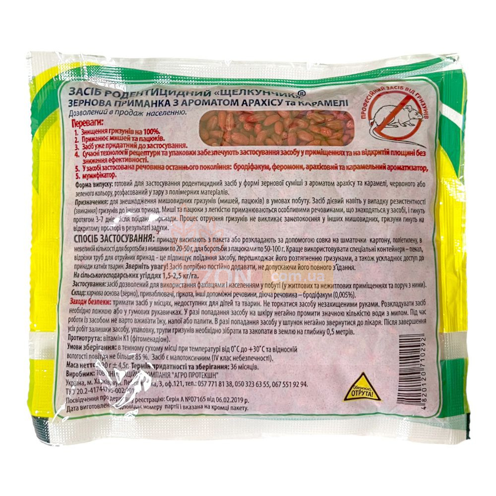 Зерно для устранения крыс и мышей с нотками арахиса и карамели под названием Щелкунчик от компании Agro Protection Украина – готовый к использованию продукт. Этот родентицид, выполненный в форме обработанной зерновой смеси с запахом арахиса и карамели, применяется для уничтожения крыс, серых и черных мышей, а также полевок на приусадебных территориях, фермерских землях, в жилых и нежилых зданиях. Приманка Щелкунчик включает активное вещество – бродифакум, являющееся антикоагулянтом крови. Спустя сутки после приема средства у грызуна резко уменьшается способность крови свертываться, что ведет к внутреннему кровотечению и гибели животного. Гибель наступает в течение 3-7 дней после поедания приманки. У остальных особей это не вызывает тревоги или страха, так как грызуны покидают помещение и умирают на открытой местности от удушья. В состав средства входит мумификатор, исключающий неприятный запах мертвых животных и предотвращающий их разложение.