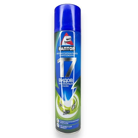 Універсальний аерозоль Раптор від 17 видів комах - це ефективний засіб захисту від широкого спектру комах, який підходить для використання всередині та поза приміщеннями. Він ефективний проти 17 видів комах, включаючи мух, комарів, мошок, клопів, тарганів, мурах, бліх та інших.