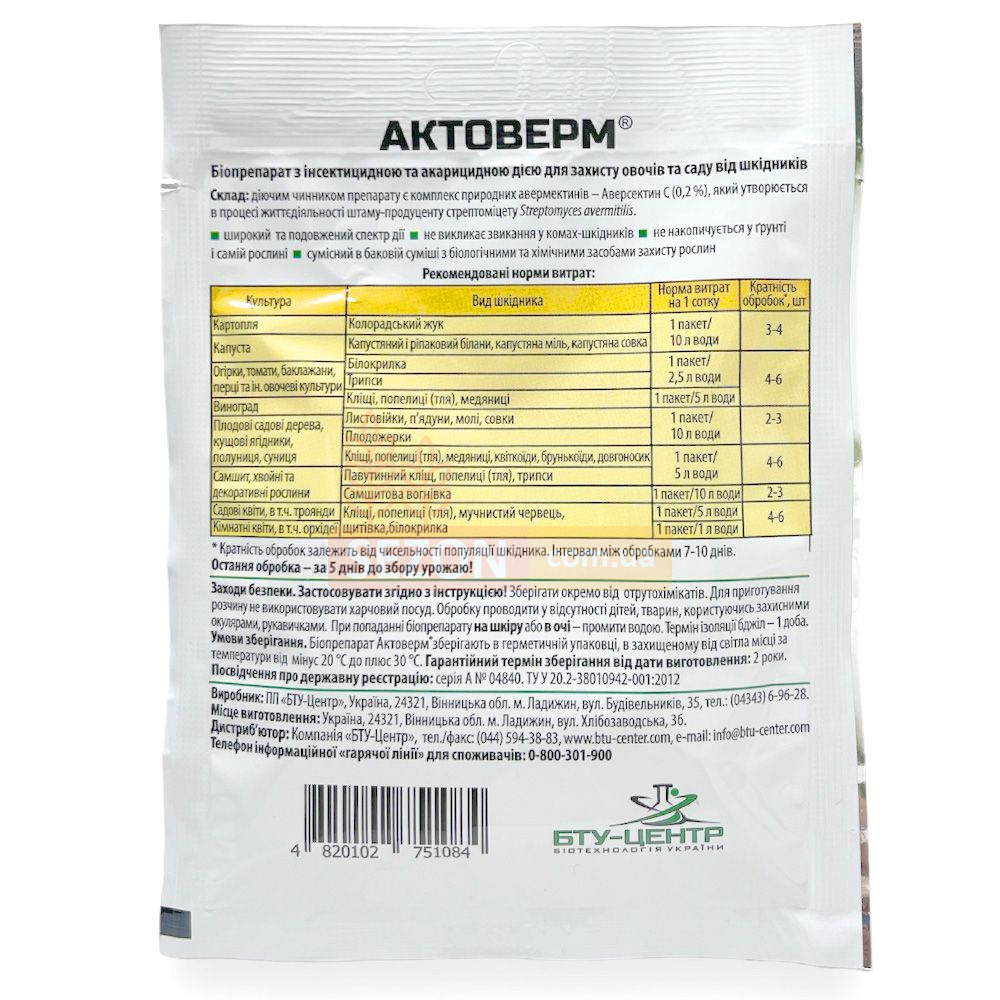 Препарат містить комплекс природних авермектинів - Аверсектин С (0,2%), що отримується від стрептоміцети Streptomyces avermitilis, який має високу інсектицидну та акарицидну активність. Біологічна дія препарату заснована на властивостях Аверсектину С (0,2%), який є природним нейротоксином, що викликає параліч комах та кліщів. Шкідники гинуть через 3-7 днів після обробки, а захисна дія триває в середньому 14 днів.
