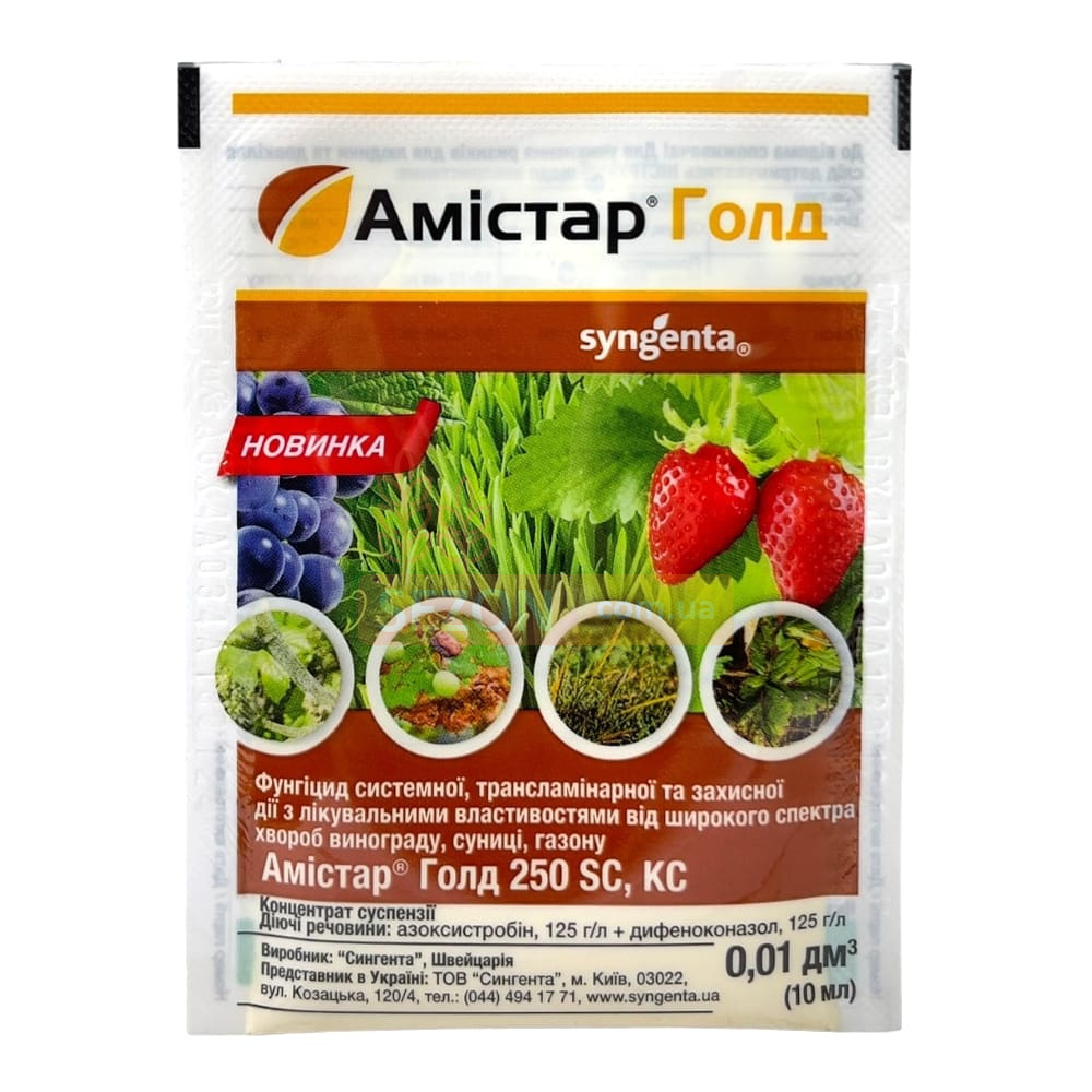 Фунгіцид має виражену лікувальну дію, знищуючи збудників хвороб на ранніх стадіях та запобігаючи розвитку захворювання на пізніх етапах. Завдяки трансламінарним властивостям, препарат швидко проникає в листя, пригнічує ріст субкутикулярного міцелію та знижує рівень спороношення патогенів. Окрім захисної функції, Амістар Голд стимулює розвиток рослин, збільшуючи площу листя, довжину пагонів та їхню облистяність, а також покращує закладку врожаю наступного року.