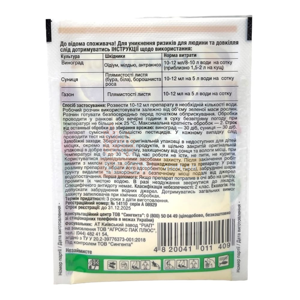 | Суниця | Борошниста роса, бура і біла плямистість, сіра гниль | Обприскування в період вегетації | 10 мл на 5 л води/1 сотку | 2/30 |
