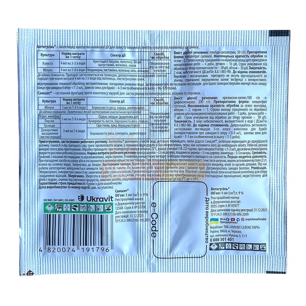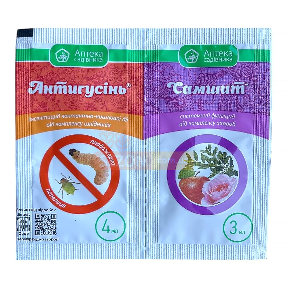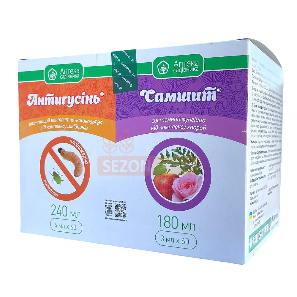 Антигусин – контактно-кишковий інсектицид, який вражає нервову систему шкідника та як результат його швидку загибель. Препарат рекомендується застосовувати в період масового розмноження (відкладання яєць) жуків. До появи личинок першого покоління. Норма витрати: 200-300 л/га для польових культур та 800-1000 л/га для плодових культур. Спектр дії: яблучна моль, плодовий пильщик, капустяна моль, американський білий метелик, листоїд, білянка, кліщ, капустяна совка та інші. Самшит – системний фунгіцид із широким спектром захисної дії. Ефективний у боротьбі з грибковими хворобами яблунь, персиків, виноградника. Стійкий до змивання. Збільшує кількість та якість плодових зав'язей. Норма витрати: 3-6 мл 5-8 л води. Приготовленого розчину достатньо для обприскування 1 сотки необхідної території. Спектр дії: парша, борошниста роса, мілдью, гниль, оідіум, фітофтороз, альтернаріоз.