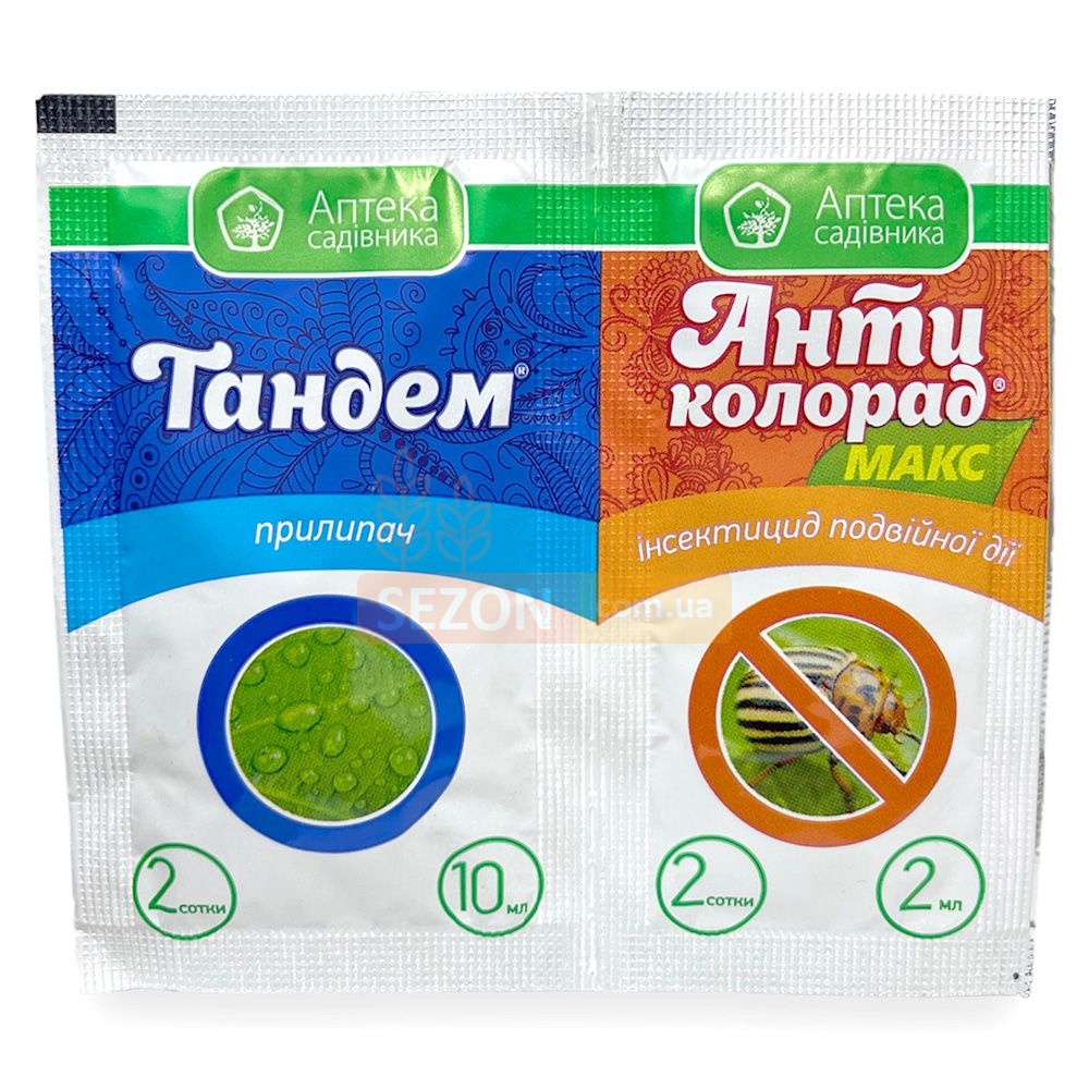 Антиколорад Макс – це контактно-системний інсектицид подвійної дії, призначений для боротьби з широким спектром шкідників на овочевих, зернових, плодових, ягідних та технічних культурах. Препарат забезпечує швидкий нокдаун-ефект, знищуючи шкідників на всіх стадіях розвитку. До складу комплекту входить прилипач Тандем, який покращує розподіл робочого розчину по листковій поверхні, підсилює його фіксацію та запобігає змиванню опадами.