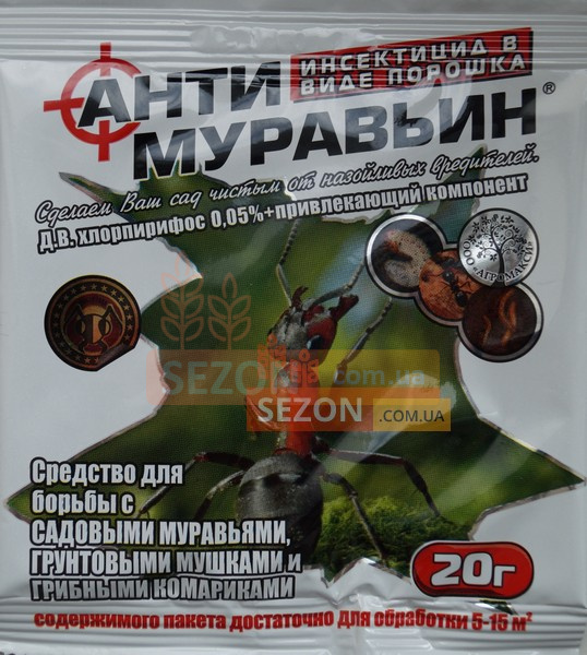 Антимурашин – інсектицид, який призначений для винищення чорних садових та рудих домашніх мурах. Склад: хлорпірифос, цукор, барвник, привабник.