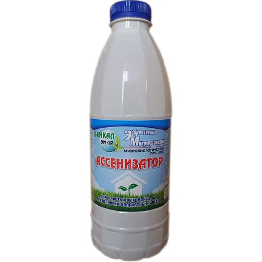 Мікробіологічний препарат "Байкал" ЕМ-1Р Асенізатор ефективний для очищення вигрібних ям та усунення неприємних запахів. Препарат складається з молочнокислих та азотофіксуючих бактерій, продуктів життєдіяльності організмів. Біопрепарат Асенізатор відмінно очищає вигрібні та зливні ями, вуличні туалети, дозволяючи не вдаватися до послуг спеціаліста. Проводить переробку вмісту вигрібних ям в екологічно чисту рідину або компост, яка може використовуватися на городі. Біопрепарат Асенізатор ефективно бореться із замулюванням вигрібних ям, знищує патогенну мікрофлору, очищає каналізаційні труби від наростів та осаду.