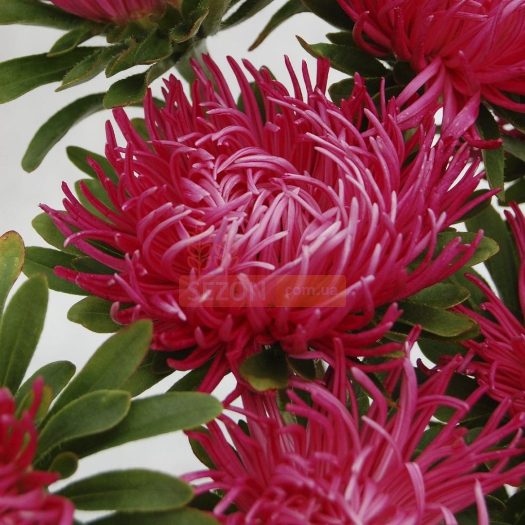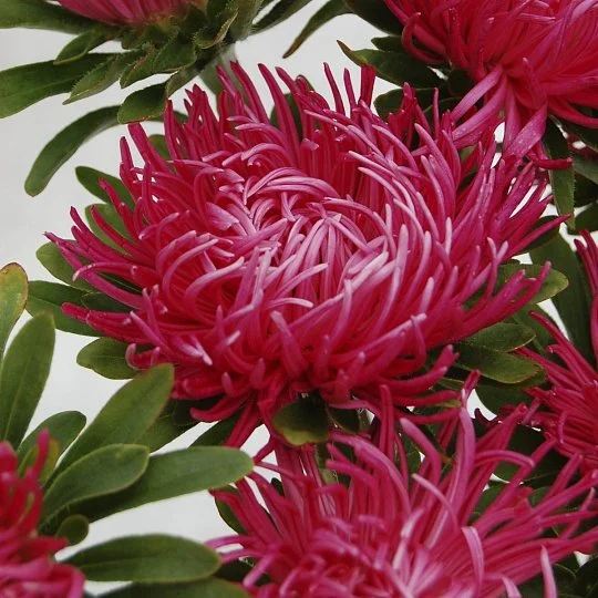 Астра китайська Дрегон (Callistephus chinensis Dragon). Декоративна та елегантна серія з надзвичайними суцвіттями кігткової форми. Діаметр квітки досягає 10-12 см. Висота рослини 65-75 см. Кущ пірамідальної форми, розгалужений біля основи. Квітконоси довгі та міцні, чудово зберігаються та транспортуються. На розсаду насіння висівають у березні – квітні. Пікірування проводять у фазі 2-3 справжніх листочків за схемою 5x5. У відкритий ґрунт рослини висаджують у середині травня. При безрозсадному способі насіння висівають на постійне місце провесною або під зиму. Невибаглива культура добре реагує на підживлення. Використовується для озеленення присадибних ділянок та високоякісного зрізу. Довгий час квіти зберігають декоративність у вазі.