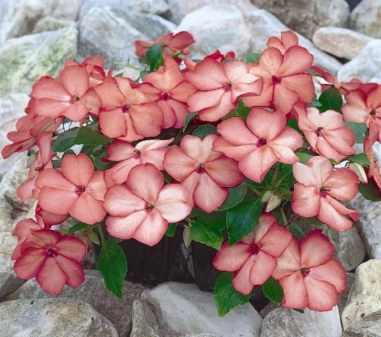 Бальзамін Воллера Баланс F1 (Impatiens walleriana Balance F1). Кущ з гарними яскравими квітами забарвлення лососевого пікоти є карликовим гібридом і має висоту 10-20 см. Рослина тепло- і вологолюбна. Цвіте з червня до заморозків, а в кімнатних умовах цілий рік за температури не нижче 16 °С. Сходи з'являються через 14-20 днів після сівби. На відкритий ґрунт рослини висаджують у травні. Найчастіше Бальзамін Уоллера Баланс вирощують удома або використовують для ландшафтного дизайну.