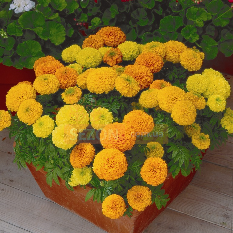 Чорнобривці Антигуа - компактний гібрид, що досягає в ширину і висоту 25-30 см. Гібрид толерантний до тривалості світлового дня. Квітки за розміром досягають 8-10 см у діаметрі, махрові та яскравих забарвлень. На початку квітня насіння висівають на розсаду, вже за 5-6 днів з'являються сходи. У відкритий ґрунт саджають у травні.