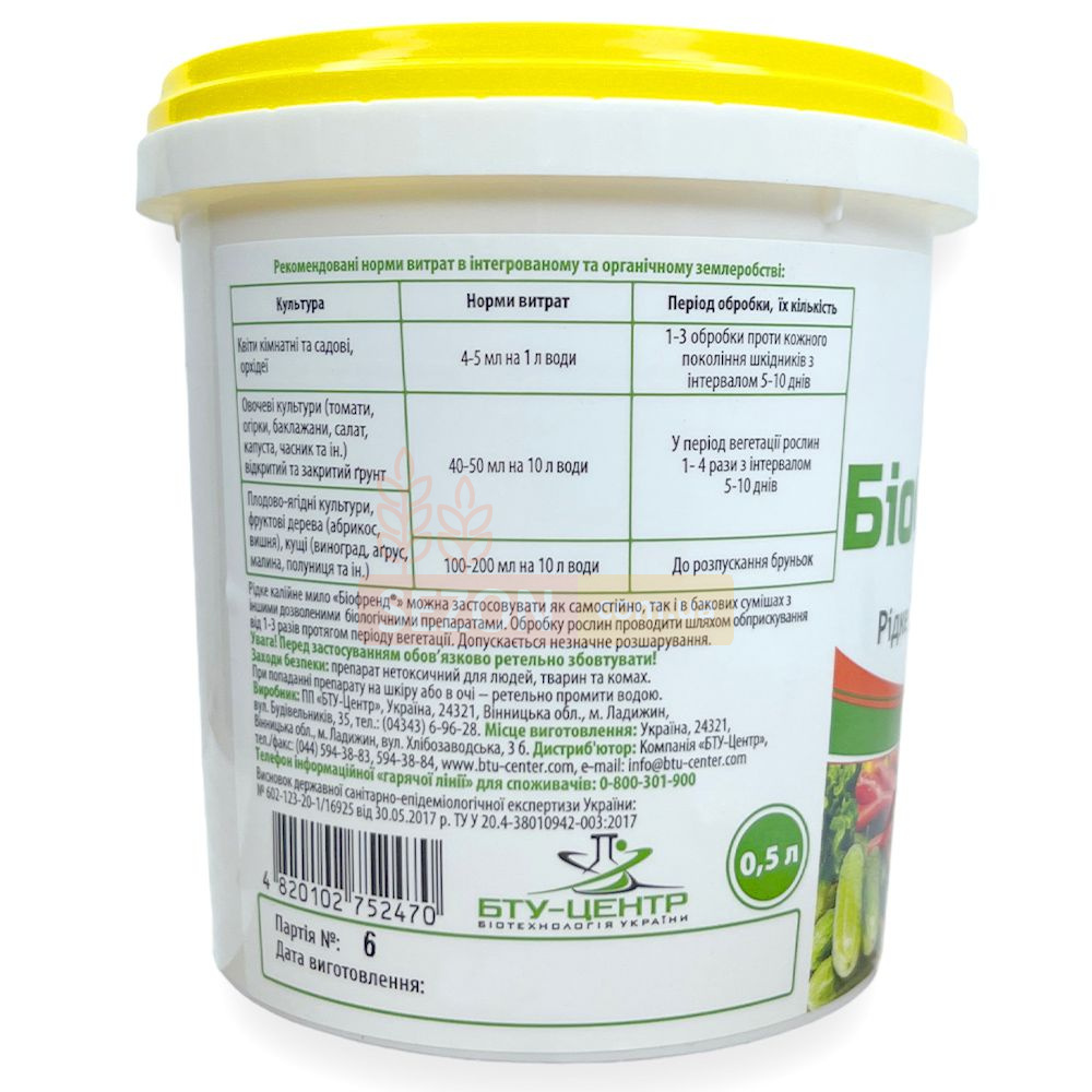 Рідке калійне мило БІОФРЕНД застосовується у формі робочого розчину. Розмішайте заздалегідь певну кількість препарату з невеликим об'ємом води, потім додайте в ємність бака, заповнену водою до 2/3 об'єму. Додайте інсектициди та (або) фунгіциди та доведіть обсяг до необхідного.