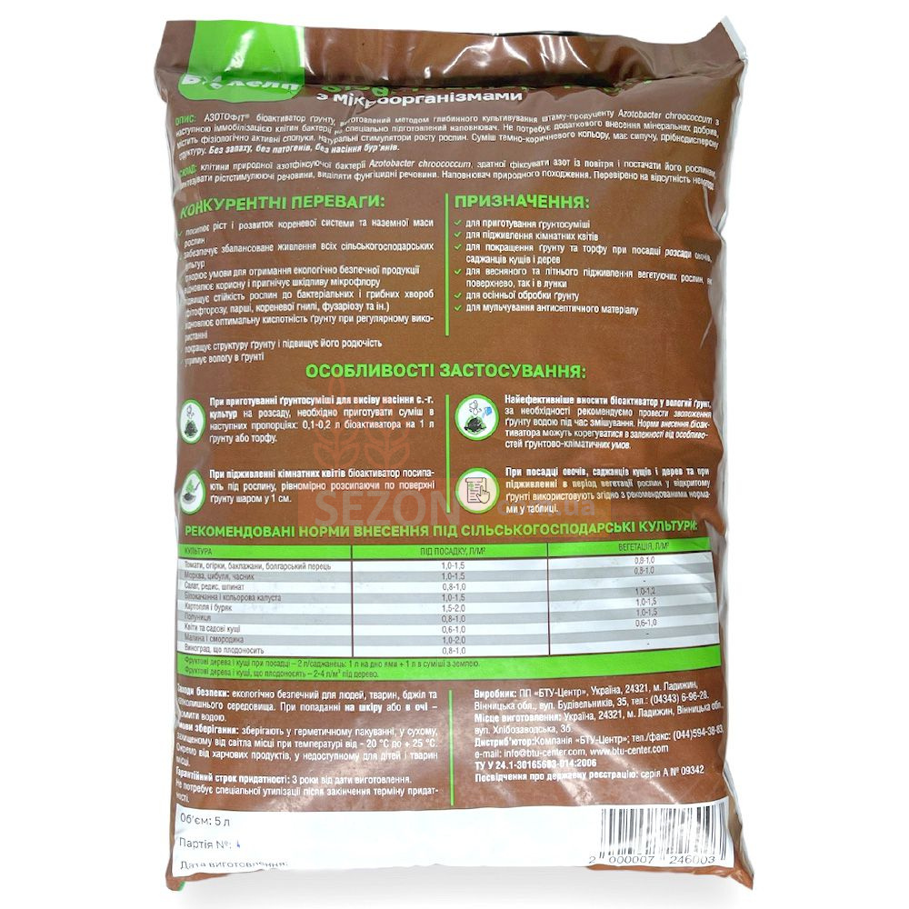 клітини природної азотфіксуючої бактерії Azotobacter chroococcum, здатної засвоювати азот з атмосфери та постачати їм рослини, виробляти стимулюючі зростання речовини та виділяти фунгіцидні компоненти. Наповнювач природного походження.