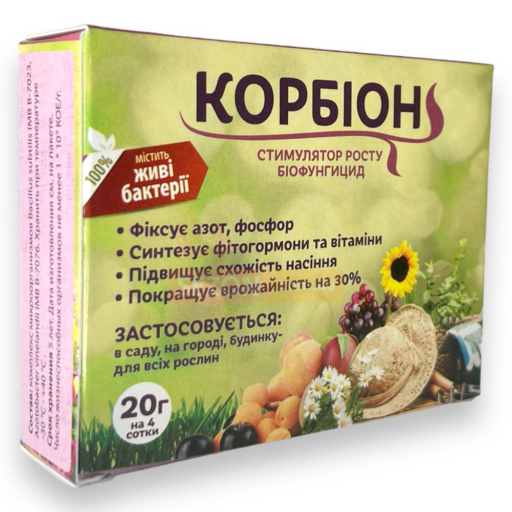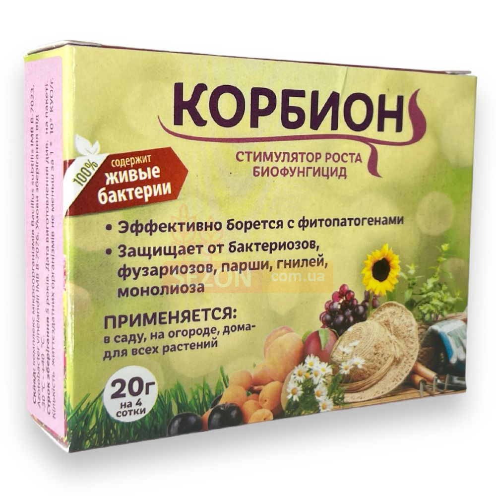 Одним з найважливіших факторів, що забезпечує високу родючість грунту, є функціонування її мікрофлори. Комбінований бактеріальний препарат «КОРБИОН» комплексної дії , допоможе вам в цьому. До складу входять активні біологічні агенти Bacillus subtilis ІМВ В-7023 - фосфатмобілізуючі бактерії, що забезпечують бактеріальний захист від фітопатогенів, грибків, гнилей та Azotobacter vinelandii ІМВ В-7076 - активний азотфиксатор і продуцент фітогормонів і росту стимулюючих речовин. Бактерії синтезують флуоресцентні пігменти жовто-зеленого кольору, які захищають рослину від ультрафіолетового випромінювання, покращують процеси фотосинтезу і дихання, що позитивно відбивається на якості врожаю.