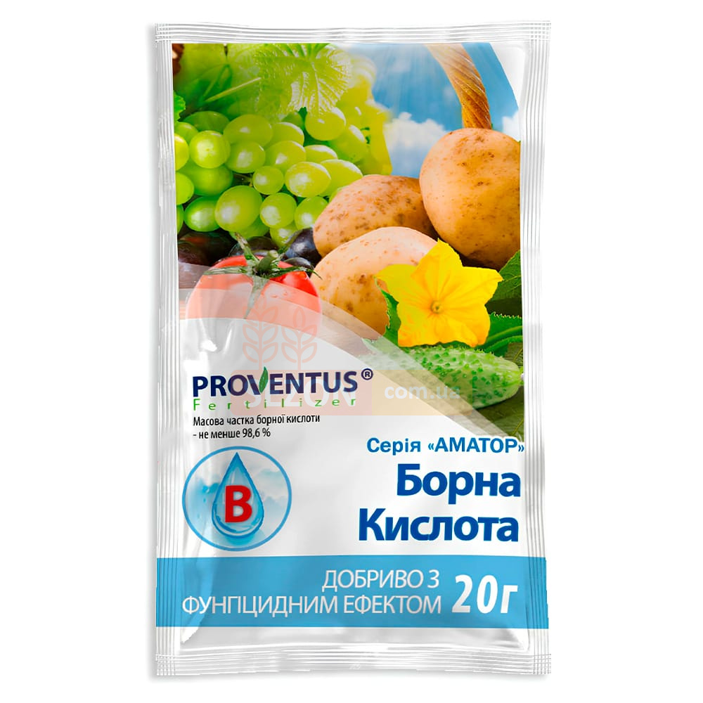 Борна кислота Провентус застосовується як добриво з додатковою фунгіцидною дією для приватних господарств при вирощуванні сільськогосподарських культур. Вона покращує врожайність, сприяє накопиченню цукрів, вітаміну С та каротину в плодах, посилює цвітіння та стимулює розвиток рослин. Для плодо-ягідних і декоративних квітучих культур бор є найважливішим елементом протягом усього вегетаційного періоду. Обробка борною кислотою покращує постачання коренів киснем, підвищує засвоєння кальцію, збільшує кількість хлорофілу в листках і нормалізує обмінні процеси. При замочуванні насіння або бульб препарат стимулює їх проростання та підвищує енергію росту.