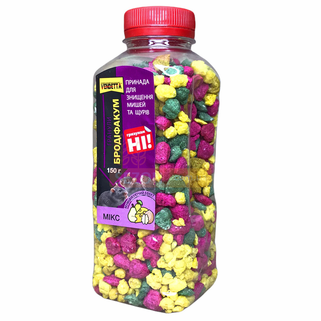 Родентицидний засіб "Бродіфакум" у вигляді гранул використовується для знищення щурів та мишей, для дератизації на об'єктах різних категорій та в умовах побуту як готова приманка. Механізм дії засобу складається із властивостей діючої речовини. Воно є антикоагулянтом, який при попаданні в організм шкідника порушує утворення вітаміну К1, який відповідає за утворення білків протромбінового комплексу. Через 1-2 дні після вживання летальної дози приманки, рівень згортання крові у гризунів різко сповільнюється, що призводить до кровотеч як внутрішніх, так і зовнішніх. Загибель настає через 3-7 діб.
