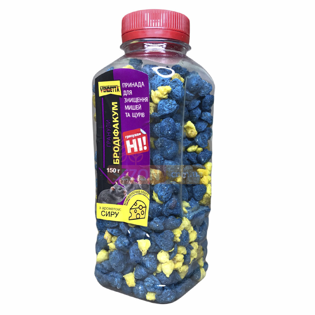 Родентицидний засіб "Бродіфакум" у вигляді гранул використовується для знищення щурів та мишей, для дератизації на об'єктах різних категорій та в умовах побуту як готова приманка. Механізм дії засобу складається із властивостей діючої речовини. Воно є антикоагулянтом, який при попаданні в організм шкідника порушує утворення вітаміну К1, який відповідає за утворення білків протромбінового комплексу. Через 1-2 дні після вживання летальної дози приманки, рівень згортання крові у гризунів різко сповільнюється, що призводить до кровотеч як внутрішніх, так і зовнішніх. Загибель настає через 3-7 діб.