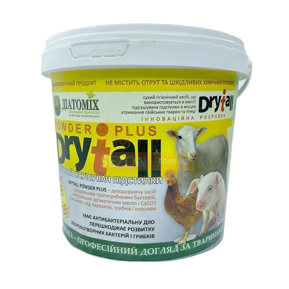 Осушитель подстилки Drytall — это современное натуральное средство для снижения влажности и подавления патогенной микрофлоры в местах содержания птицы, свиней и крупного рогатого скота. Его основа — диатомит тонкого помола (фракция 100 мкм), обладающий высокой влагоемкостью, бактерицидным, инсектицидным и дезодорирующим действием.