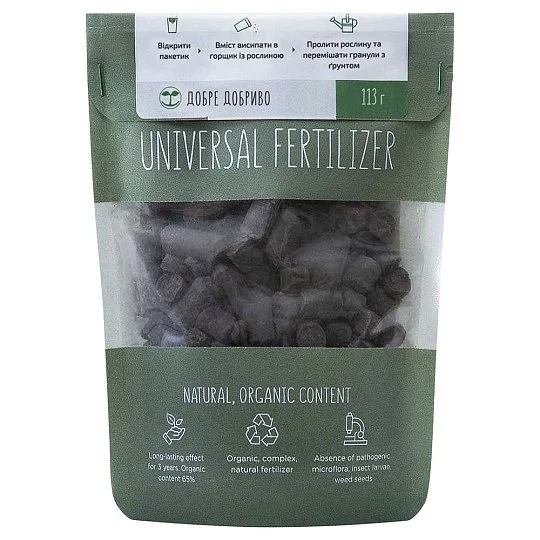 Гранульоване органічне удобрення «Добре Добриво універсальне» — комплексне, біоактивне, натуральне удобрення тривалої дії, протягом 3 років. Продукт є гранульованим, екологічно чистим органічним удобренням, яке виробляється без застосування хімії. Поставляється в 113 г упаковці, яка має для більшої зручності споживача зип-застібку, вміст вологи у добриві становить менше 10%, тим самим виділяючи наш продукт на фоні інших конкурентів ринку України.