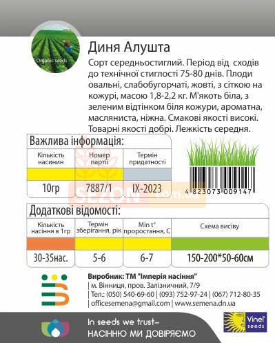 Сорт ранній, стійкий до повітряної та ґрунтової посухи, транспортабельний. До збирання 77 днів. Плід овальний, масою 1.8-2 кг, поверхня слобобугриста, жовта. М'якуш білий, товстий, маслянистий, ніжний, солодкий, соковитий, з цим ароматом. Стійкий до антрактозу, борошнистої та сірої гнилі. Вимоглива до тепла, жаростійка, високостійка до нестачі вологи. Рослини потребує гарного освітлення. Краще вирощувати на родючих ґрунтах: темних супісках та легких суглинах. Висівають при температурі ґрунту 13 градусів, за схемою 140x70 см, по одній рослині в гнізді. Глибина загортання насіння 3-4 см. Для отримання ранньої продукції застосовують розсадний спосіб вирощування, парники, тимчасові плівкові укриття, розсаду вирощують протягом 25-30 діб.