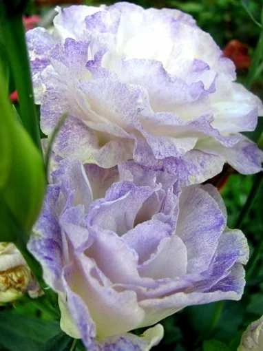 Еустома (Eustoma grandiflorum) АВС F1 - однорічна великоквіткова рослина. Висота рослини 90-110 см. Квітки махрові, білі з блакитним рум'янцем кольору, схожі на бутони троянд. Цвіте рясно та тривало. Рослина сонцелюбна, віддає перевагу окультуреним грунтам, вимагає регулярного поливу і обприскування. Відмінно підходить для зрізу. Цвіте з липня до серпня.