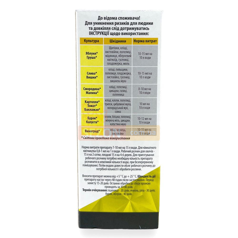 | Картопля | Колорадський жук, попелиці | 3,6 мл на 10 л води/5 л на 1 сотку | 20 | 2 |